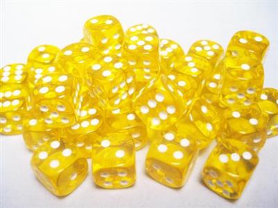 Chessex Translucent 12mm d6 with pips Dice Blocks (36 Dice) – Yellow w/white (Kauliukai)