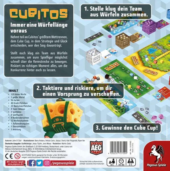 In Cubitos, players take on the role of participants in the annual Cube Cup, a race of strategy and luck to determine the Cubitos Champion. Each player has a runner on the racetrack and a support team, which is represented by all the dice you roll. Each turn, you roll dice and use their results to move along the racetrack, buy new dice, and use abilities — but you must be careful not to push your luck rolling too much or you could bust!