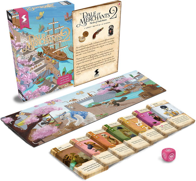 Dale of Merchants 2 contains six new decks and can be played by itself or combined with the decks from Dale of Merchants. The game includes a new ruleset for four players that introduces team battle! These new rules greatly enhance the four-player experience by adding cooperation between teammates and cutting downtime. These rules can also be used with the original game’s six decks.