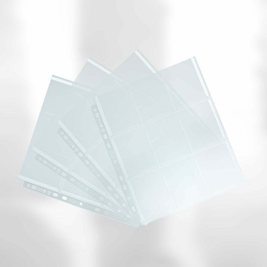 High-quality 9-pocket pages for standard- and Japanese-sized cards, made from extra clear polypropylene. Due to the versatile 11-hole spine these pages fit in almost all standard-sized ring-binders. The pockets are loaded from the top and will protect even double-sleeved cards perfectly. Welded joints, made with ultrasonic technology, provide strong and precisely measured card pockets.