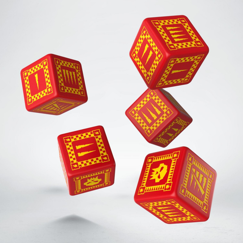 Orkų tematikos 5 šešiasieniai raudoni ir geltoni kauliukai, su unikaliais skaičiais ir raštais.
