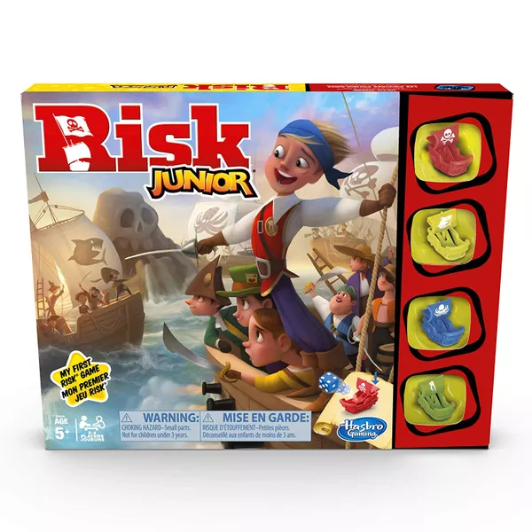 Mūšis dėl lobių atviroje jūroje! Stalo žaidimas „Risk Jr.“ pasižymi lengvai suprantamomis taisyklėmis, patrauklia piratų tema ir drąsiais, spalvingais meno kūriniais. Vaikai judina savo valties žetoną aplink žaidimo lentą, ieškodami palaidoto lobio, kovodami už salų valdymą, siekdami surinkti daugiausiai grobio, kad laimėtų. Žaidimo nereikia skaityti, jį galima greitai paruošti ir žaisti per mažiau nei 30 minučių. Įtraukite 5 metų ir vyresnius šeimos narius su šiuo jaunesniuoju klasikinio strateginio kovinio žaidimo leidimu.