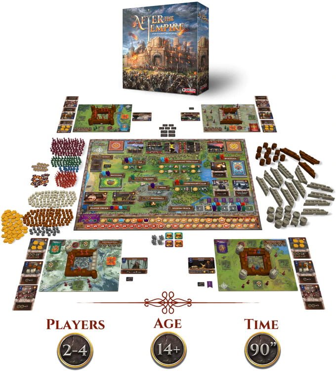 After The Empire is a worker placement/resource management game set in the middle ages. During each turn, known as a season, players alternate using worker tokens to take actions, such as gathering resources, building advanced buildings and recruiting refugees from either the shared game board or their personal fiefdom. Once all workers have been committed, players harvest food from their surrounding lands and then prepare for combat.