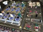 Second, the water flow on the rivers depicted on the board is a shared and contested resource. Players have to intercept and store as much of the water as they can, build dams (upstream dams are expensive but can block part of the water before it reaches the downstream dams), raise the dams to increase their capacity, and build long tunnels to channel the water to their powerhouses. Water is never consumed — its flow is just used to produce energy —, it is instead released back to the rivers, so you have to strategically place your dams to recover the water diverted by you and the other players.