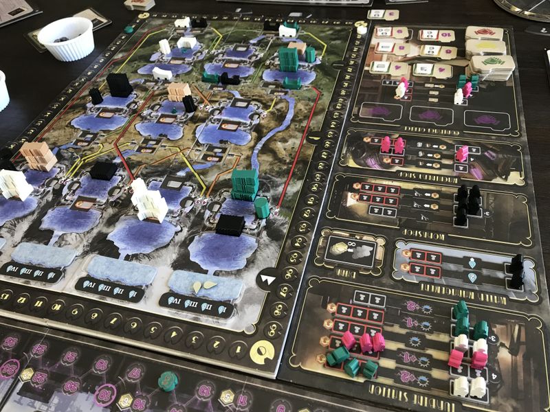 Over five rounds, the players must fulfill power requirements represented by a common competitive power track and meet specific requests of personal contracts. At the same time, by placing a limited number of engineers, they attempt to enhance their machinery to acquire new and more efficient construction actions and to build and activate special unique-effect buildings to forward their own developing strategy.