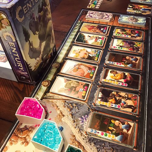 Century: Golem Edition is a re-themed version of Century: Spice Road set in the world of Caravania. In Century: Golem Edition, players are caravan leaders who travel the famed golem road to deliver crystals to the far reaches of the world. Each turn, players perform one of four actions: