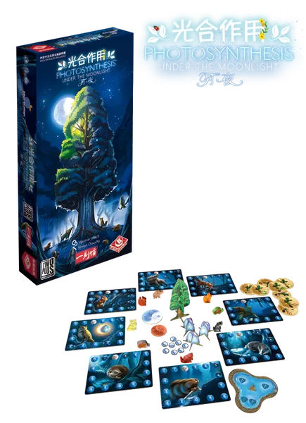 Patobulinkite Photosynthesis pasaulį su Under the Moonlight papildymu! Mėnulis sukasi į priešingą pusę nuo saulės ir skleidžia mėnulio šviesą ant miško. Žaidėjai renka lunar taškus savo naujiems miško gyvūnams, kad aktyvuoti jų specialias galias. Kuris iš aštuonių gyvūnų bus jūsų? Šernas renka medžius, ežys sodina sėklas, lapė vagia ir judina sėklas, o pelėda verčia lunar taškus į sun taškus.