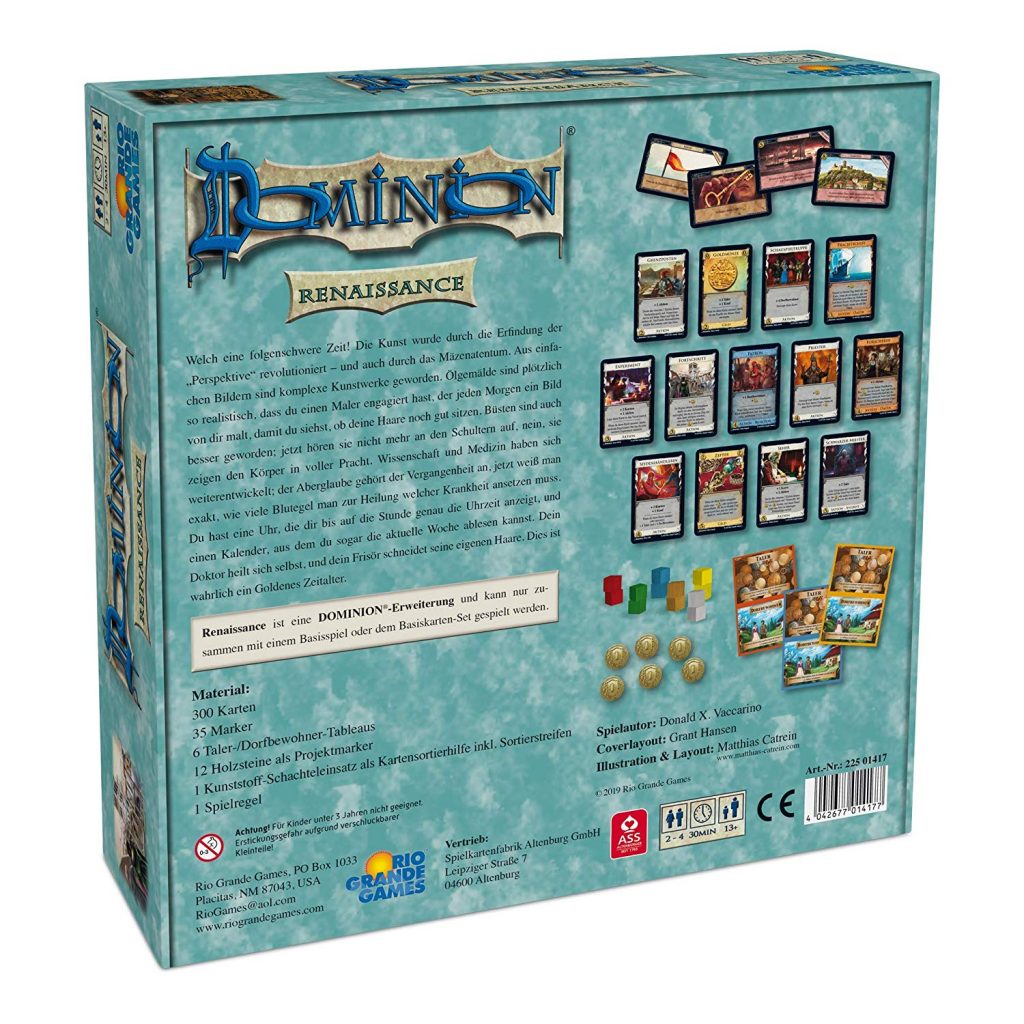 This is the 12th expansion to Dominion. It has 300 cards, with 25 new Kingdom cards. There are tokens that let you save coins and actions for later, Projects that grant abilities, and Artifacts to fight over.