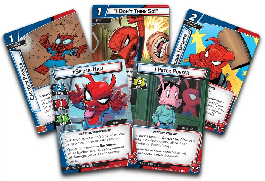 Sveiki, piliečiai! Jūs jau sutikote skraidančius herojus, genialius mokslininkus ir kosminius burtininkus. Matėte kvapą gniaužiančius Avengers, drąsiuosius Guardians ir įspūdingus Web-Warriors. Dabar laikas kiauliškai galybei, nuostabiajam super-kiaulei, juokingam tinklų mezgėjui, vieninteliam ir nepakartojamam… Spider-Ham! Šis animacinis stebuklas kertasi į jūsų Marvel Champions: The Card Game! Išnaudojantis nerealistišką filmukų fiziką ir komedinius veiksmus, Spider-Ham gali imti kirčius ir sustabdyti blogiečių planus įvairiais spalvingais būdais. Su šiuo Hero Pack, žaidėjai atras Spider-Ham, jo penkiolika signature kortų ir pilną asortimentą Justice kortų, kviečiančių juos sustabdyti blogį. Pakuotėje taipogi rasite papildomą modulinį encounter rinkinį su pažįstamais ir baisiais Inheritors.