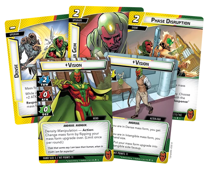 Kaip tobulas androidas, Vision atskrenda į Marvel Champions su šiuo papildymu, kuris pristato jį kaip visiškai naują herojų, kartu su 15 signature kortų. Vision atkeliauja kartu su jau surinkta Protection kalade, paruošta žaisti vos išėmus iš pakuotės. Jo mechanikos sukasi aplink unikalią tankio manipuliavimo mechaniką, kuri padaro jį strateginiu herojumi, su stulbinančiu išgyvenamumu.