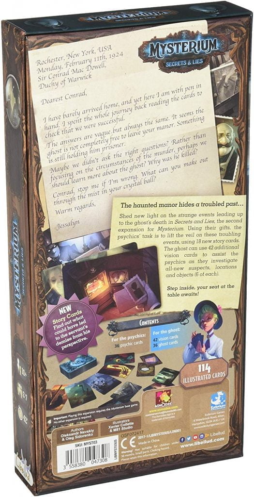 Mysterium: Secrets & Lies rasite šešis naujus veikėjus, šešias naujas vietoves, šešis naujus daiktus ir 18 story kortų. Ši paskutinė kortų grupė pakeičia object kortas žaidime, jose ant kiekvienos kortos pavaizduota vienas iš būdų, kaip vaiduoklis mirė. Dabar, vietoj bandymo ištirti objektus, pavienius daiktus be jokių niuansų, vaiduoklis turi naudoti sapnų kortas papasakoti savo mirties istoriją, kas suteikia didesnį iššūkį.