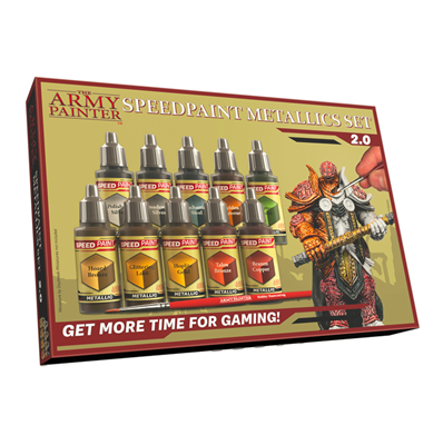 Army Painter revoliuciniai nauji Metallic Speedpaints yra lengviausias būdas išgauti metalinių paviršių efektą ant jūsų modelių, vienu dažų sluoksniu! Speedpaint Metallics Set 2.0 rasite visą rinkinį metalinių Speedpaint spalvų. Tiesiog padenkite gruntuotus paviršius vienu dažų sluoksniu ir viskas baigta!