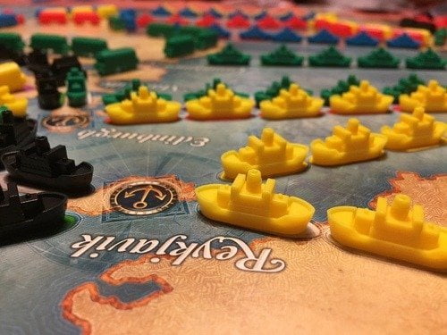 Ticket to Ride: Rails & Sails puts a few twists on the TtR formula, starting with split card decks of trains and ships (with all of the wild cards going in the train deck). Three cards of each type are revealed at the start of the game, and when you draw cards, you replace them with a card from whichever deck you like. (Shuffle the card types separately to form new decks when needed.)