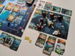 The main principle of the game is card placement. Three colored cards are placed along the edge of the main board into 3 x 5 slots, which are also colored. Ideally players can place cards into slots of the same color. Then they can take both actions and advantages: the action depicted in the slot on the main board and also the advantage of the card. Actions and advantages can allow players to intake raw materials; to build and upgrade city domes, tunnels and production buildings such as farms, desalination devices and laboratories in their personal underwater area; to move their marker on the initiative track (which is important for player order in the next turn); to activate the player’s „A-cards”; and to collect cards, both special ones and basic ones that allow for better decision possibilities during gameplay.